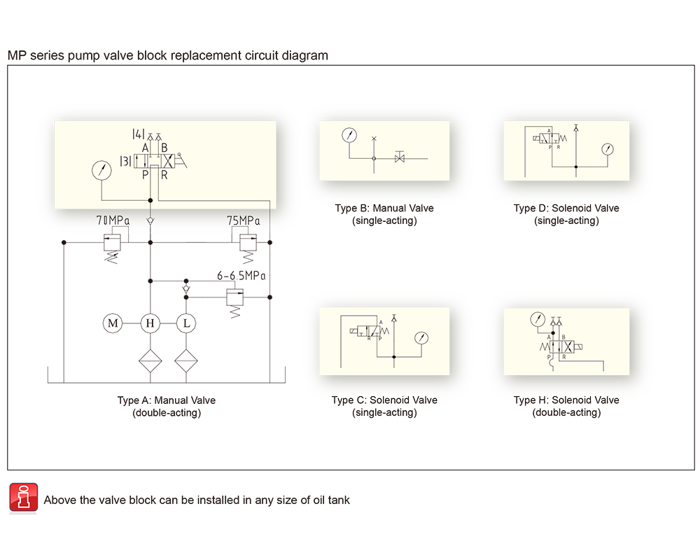 MP series electric pump adopts integrated way: by the oil pump, control valve, fuel tanks, pneumatic motor, cooler, such as instrument of a kind of independent complete hydraulic device, has small volume, light weight, simple structure, convenient operation, high working pressure, etc. The pump is high and low pressure oil pump, can obtain the larger output oil. When high pressure, the low pressure pump is automatically returned to oil by unloading overflow valve and can reduce the power consumption, and (A) the oil pressure can be adjusted by 70~ 700Bar.