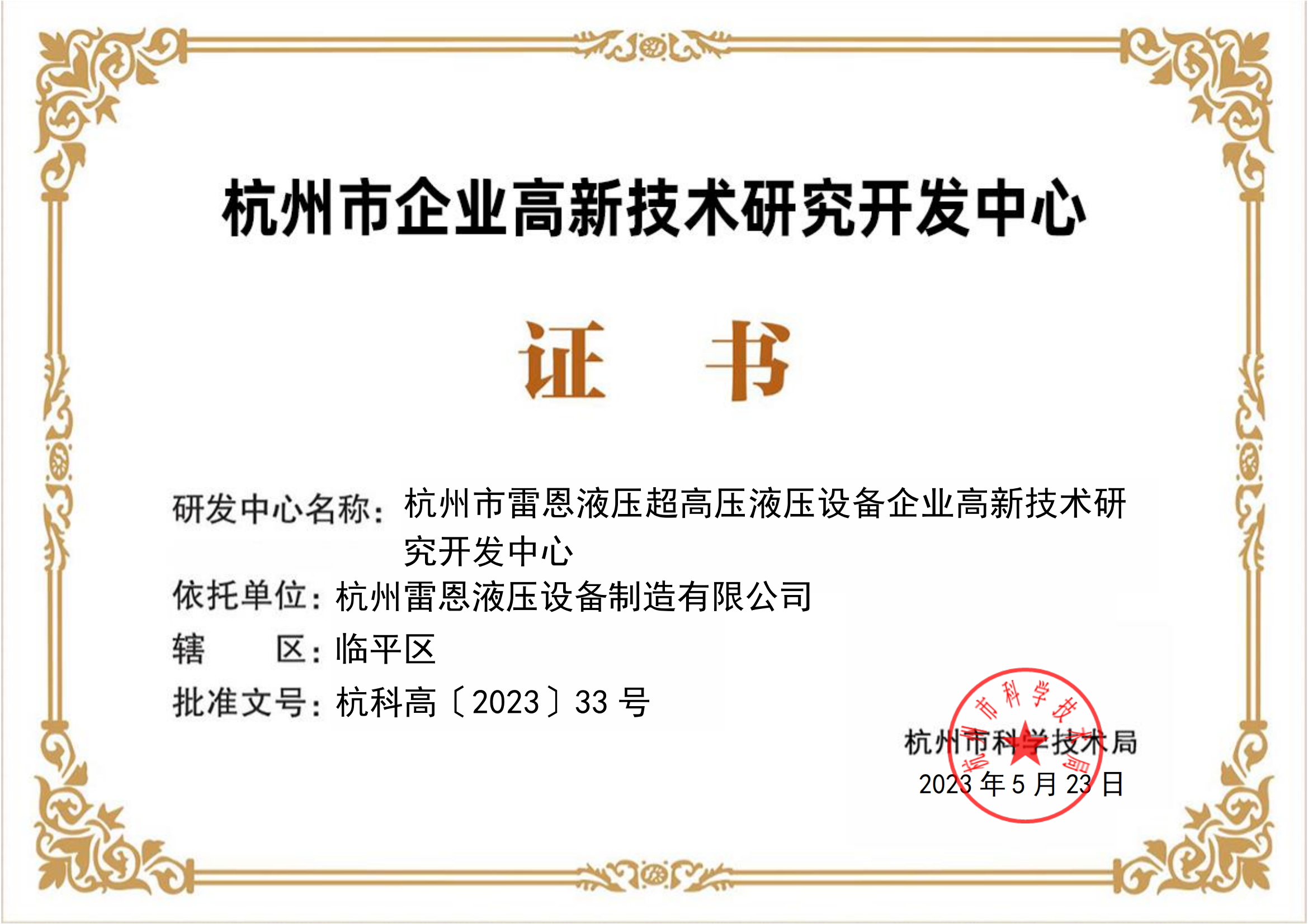 【喜訊】雷恩液壓通過“杭州市企業(yè)高新技術(shù)研究開發(fā)中心”認(rèn)定