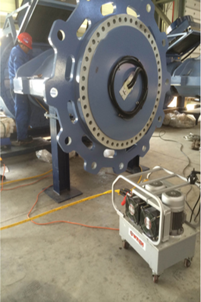 此次上海華儀客戶的現(xiàn)場工況為2.5MW風(fēng)機主軸脹緊套安裝,螺栓尺寸為M33。該處工況安裝,一直是所有風(fēng)機廠家比較拖效率的安裝工位,并且該工況相對于平常的主軸工況有所不同,軸承座離齒輪箱更近,無法放下驅(qū)動型液壓扳手,而普通的中空扳手無法滿足將脹緊套和齒輪箱的安裝到完全平整,針對這個情況,為提升客戶工作效率、減輕工作強度、釋放工作人工,我方主動研發(fā)大流量、高速雙電機泵站,型號為2ATWH DHP-380*2,并配套設(shè)計研發(fā)了加強型純平中空扳手以應(yīng)對流量大量增加后扳手的使用強度及使用壽命等問題。