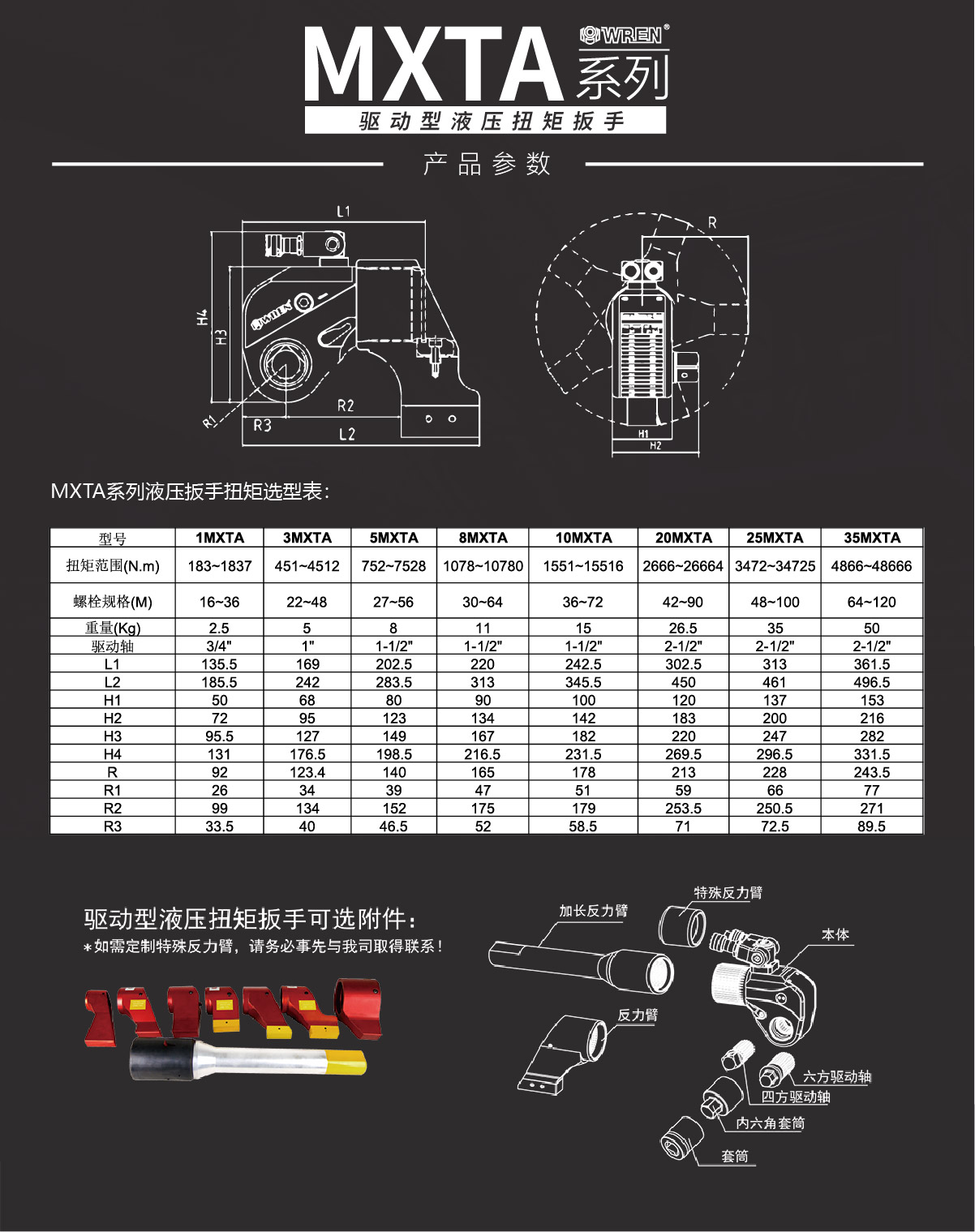 MXTA系列是WREN公司主力投放國(guó)內(nèi)市場(chǎng)的一款專業(yè)級(jí)別的液壓扭矩扳手。其鋁鈦合金的航空材料的液壓扭矩扳手重量輕,強(qiáng)度高,值得注意的是MXTA系列液壓扭矩扳手擁有從112N.m-48666N.m共8個(gè)標(biāo)準(zhǔn)型號(hào),可以出色完成螺栓的鎖緊以及拆卸工作。WREN品牌提供全球售后服務(wù),擁有完整的配套供應(yīng)能力,通過(guò)德國(guó)萊茵TUV認(rèn)證及歐盟CE認(rèn)證。