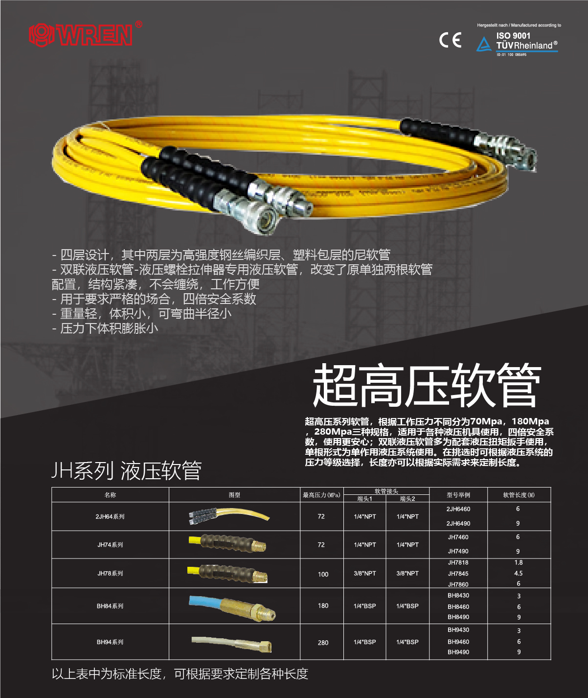 超高壓系列軟管,根據(jù)工作壓力不同分為70Mpa,180Mpa,280Mpa三種規(guī)格,適用于各種液壓機具使用,四倍安全系數(shù),使用更安心;雙聯(lián)液壓軟管多為配套液壓扭矩扳手使用,單根形式為單作用液壓系統(tǒng)使用。在挑選時可根據(jù)液壓系統(tǒng)的壓力等級選擇,長度亦可以根據(jù)實際需求來定制長度。