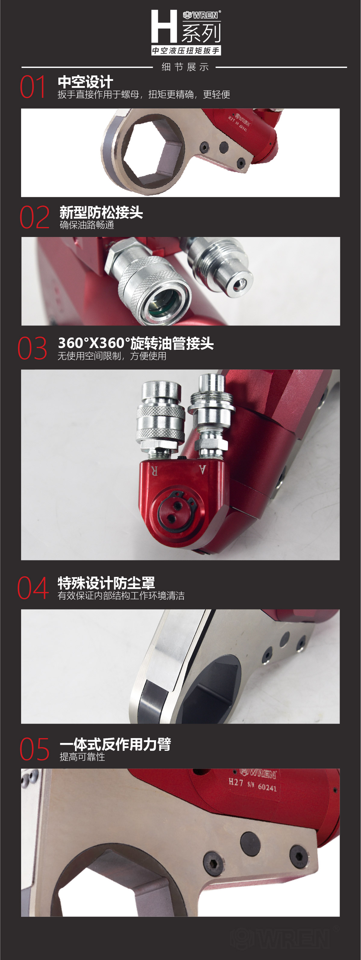H系列中空型液壓扭矩扳手是專門為狹窄空間設計的。它可以以一臺動力頭配備不同規(guī)格的工作頭來適應不同的螺栓工況,工作頭可以在沒有任何工具輔助的情況下隨意更換,而且即學即會,簡單的更換操作可以在工作中節(jié)省大量的時間,以提高工作效率。鋁鈦合金的航空材料使其擁有輕便的機身,適應超高強度的工作。WREN品牌提供全球售后服務,擁有完整的配套供應能力,通過德國萊茵TUV認證及歐盟CE認證。