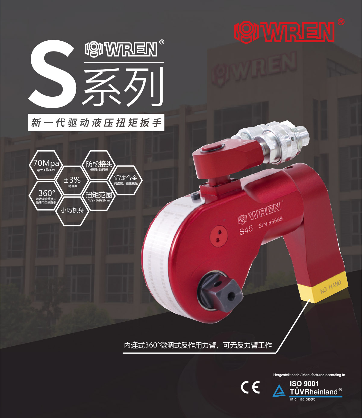 S系列驅(qū)動(dòng)型液壓扭矩扳手是融合了高科技的新一代產(chǎn)品。鋁鈦合金的航空材料液壓扳手重量輕,強(qiáng)度高,小巧的機(jī)身可以幫您完成重要的任務(wù)。S系列驅(qū)動(dòng)型液壓扭矩扳手擁有從172N.m-36992N.m共5個(gè)標(biāo)準(zhǔn)型號(hào),可以出色的完成螺栓的預(yù)緊以及拆松。WREN品牌提供全球售后服務(wù),擁有完全的配套供應(yīng)能力,通過(guò)德國(guó)萊茵TUV認(rèn)證以及歐盟CE認(rèn)證。
