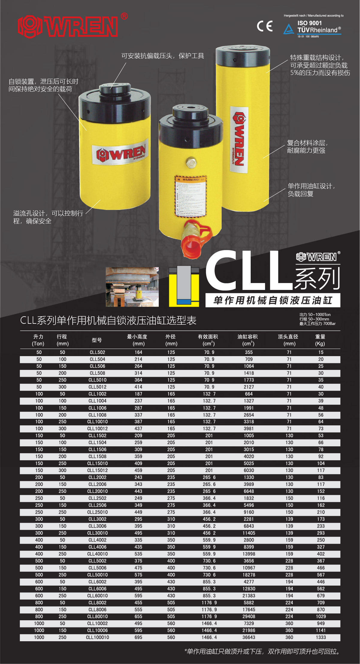 CLL系列單作用機械自鎖式液壓油缸選型表