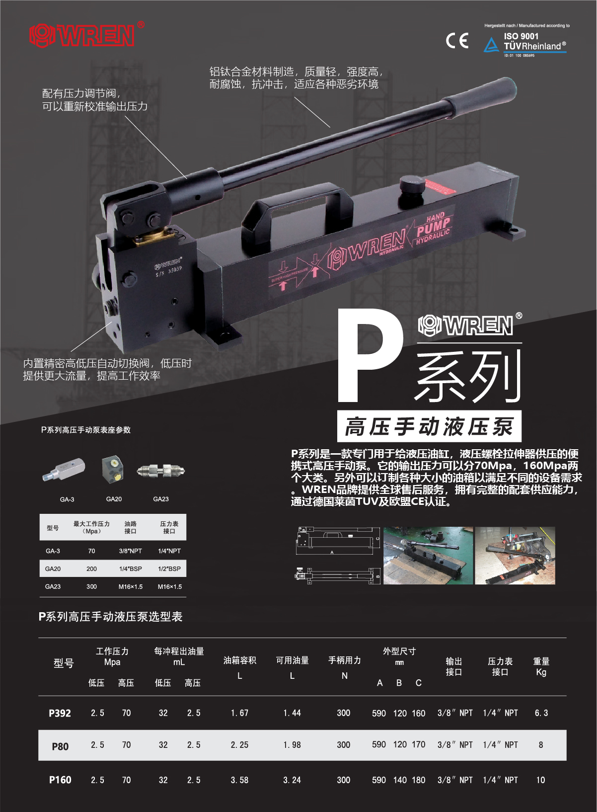 P系列是一款專(zhuān)門(mén)用于給液壓油缸供壓的便攜式高壓手動(dòng)泵它的輸出壓力是70MPa。另外可以定制各種大小的油箱以滿足不同的設(shè)備需求。WREN品牌提供全球售后服務(wù),擁有完整的配套供應(yīng)能力,通過(guò)德國(guó)萊茵TUV及歐盟CE認(rèn)證。