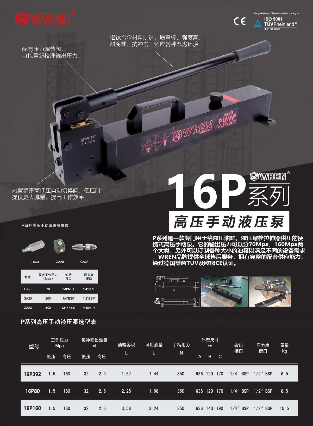 16P系列是一款專門用于給液壓螺栓拉伸器供壓的便攜式高壓手動泵它的輸出壓力是160MPa。另外可以定制各種大小的油箱以滿足不同的設(shè)備需求。WREN品牌提供全球售后服務(wù),擁有完整的配套供應(yīng)能力,通過德國萊茵TUV及歐盟CE認證。