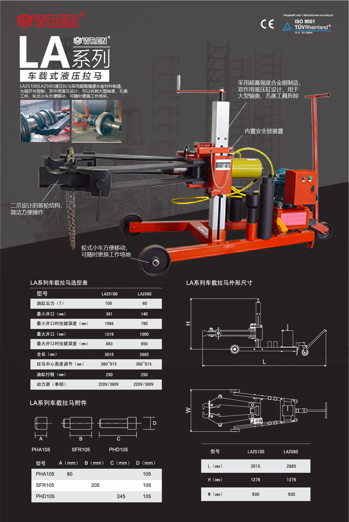 LA25100(LA2560)液壓拉馬采用超高強度合金材料制造,為線開關控制,雙作用液壓設計,可以拆卸大型軸承、孔類工件,輪式小車方便移動,可隨時更換工作場所。